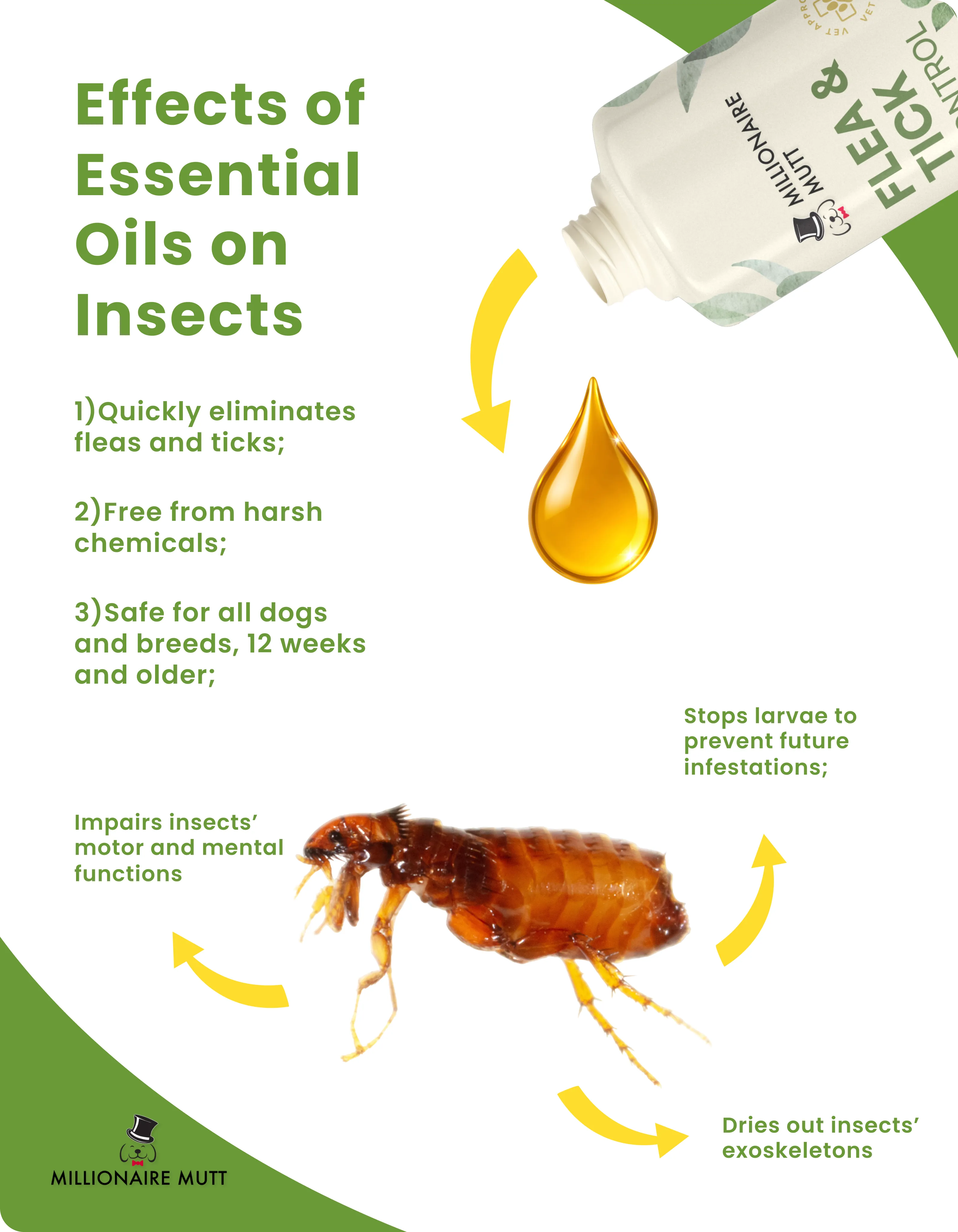 The essential oils create a protective barrier on your dog's coat that kills any flea or tick on contact - no need to spray directly on individual pests.
