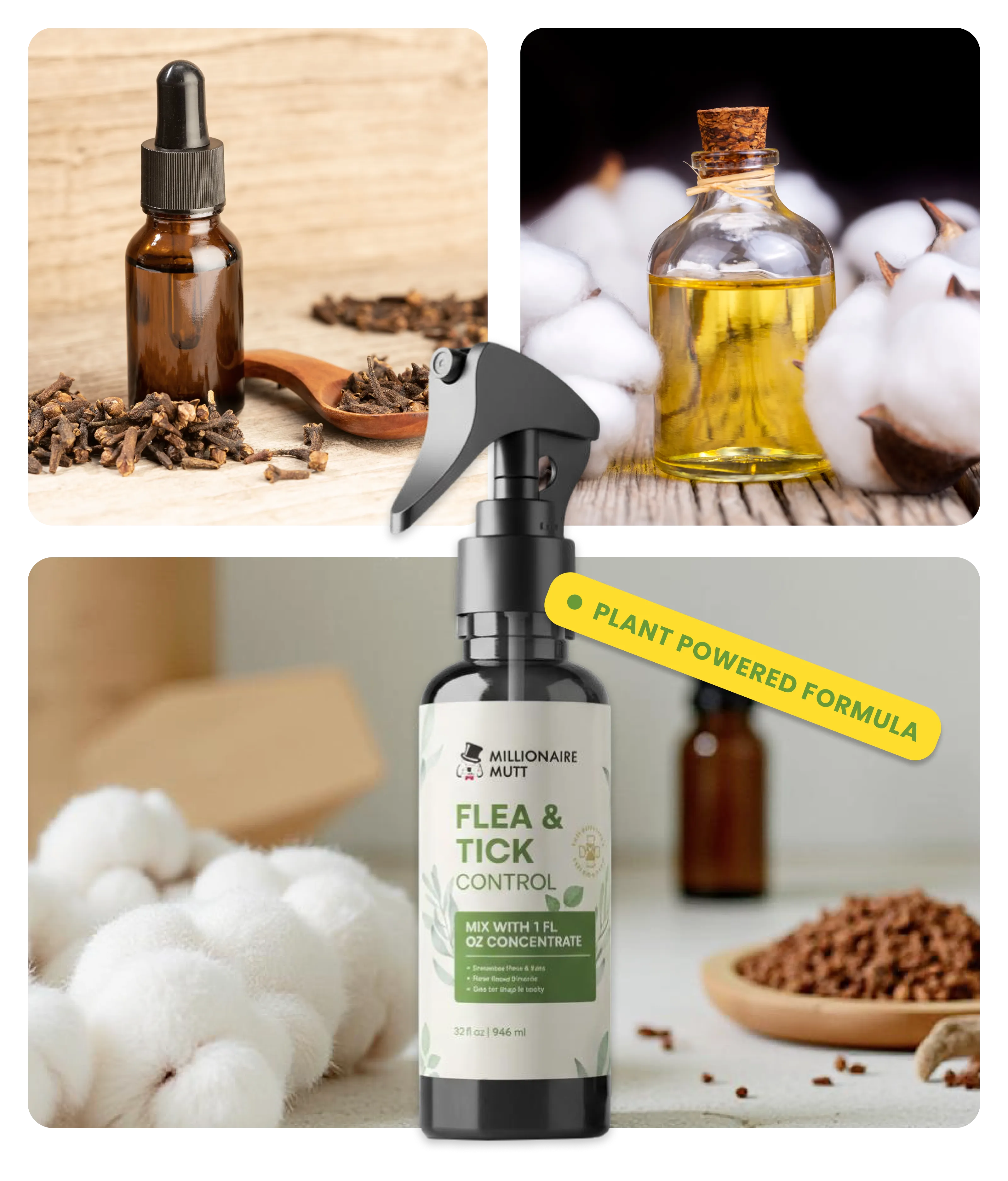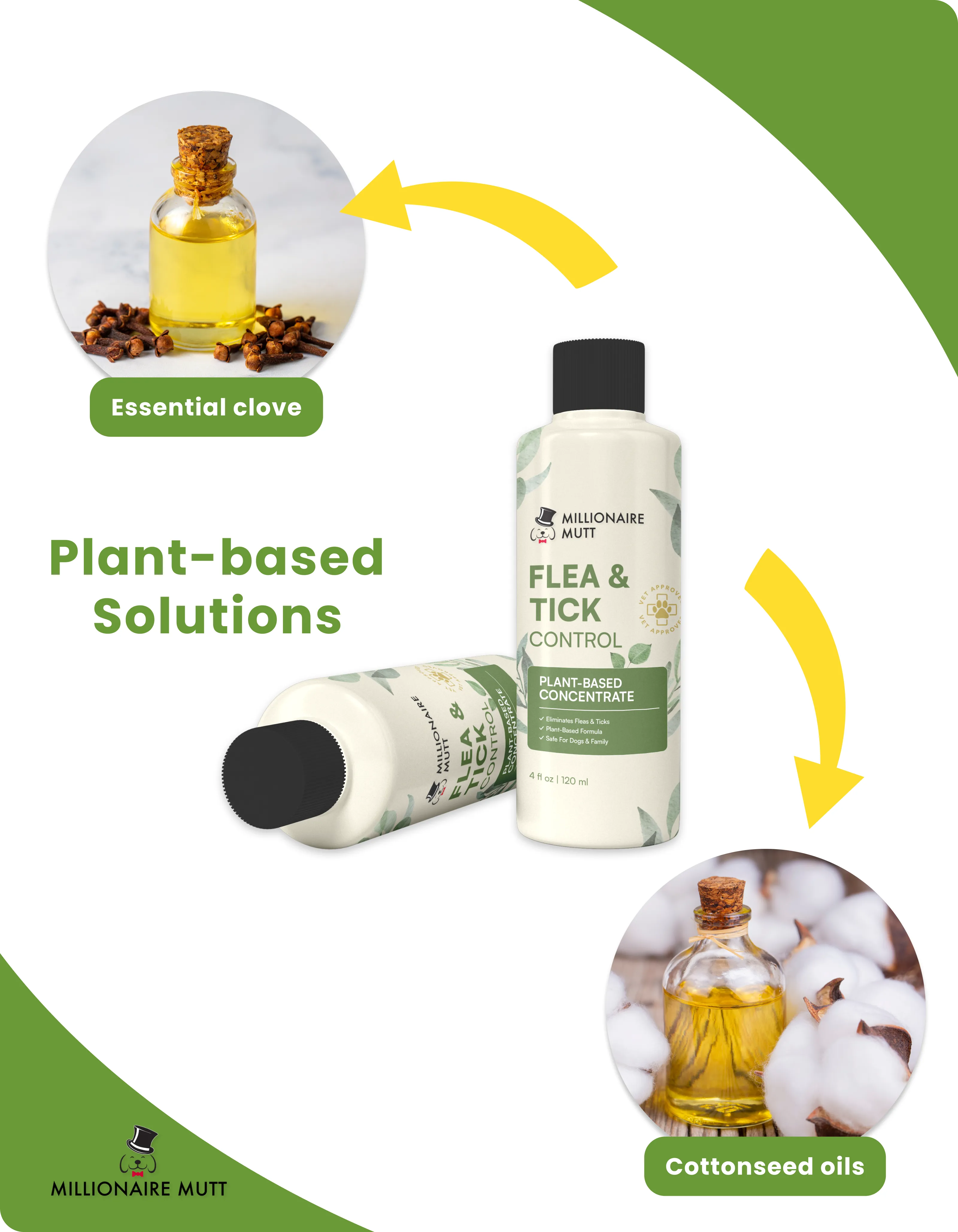 Flea & Tick Control is a dog pest control solution formulated with two powerful essential oils — Clove Oil and Cottonseed Oil — to help easily and safely* eliminate fleas and ticks. This solution does not contain harsh synthetic pesticides, organophosphates, or chemicals found in traditional flea collars or drops.
